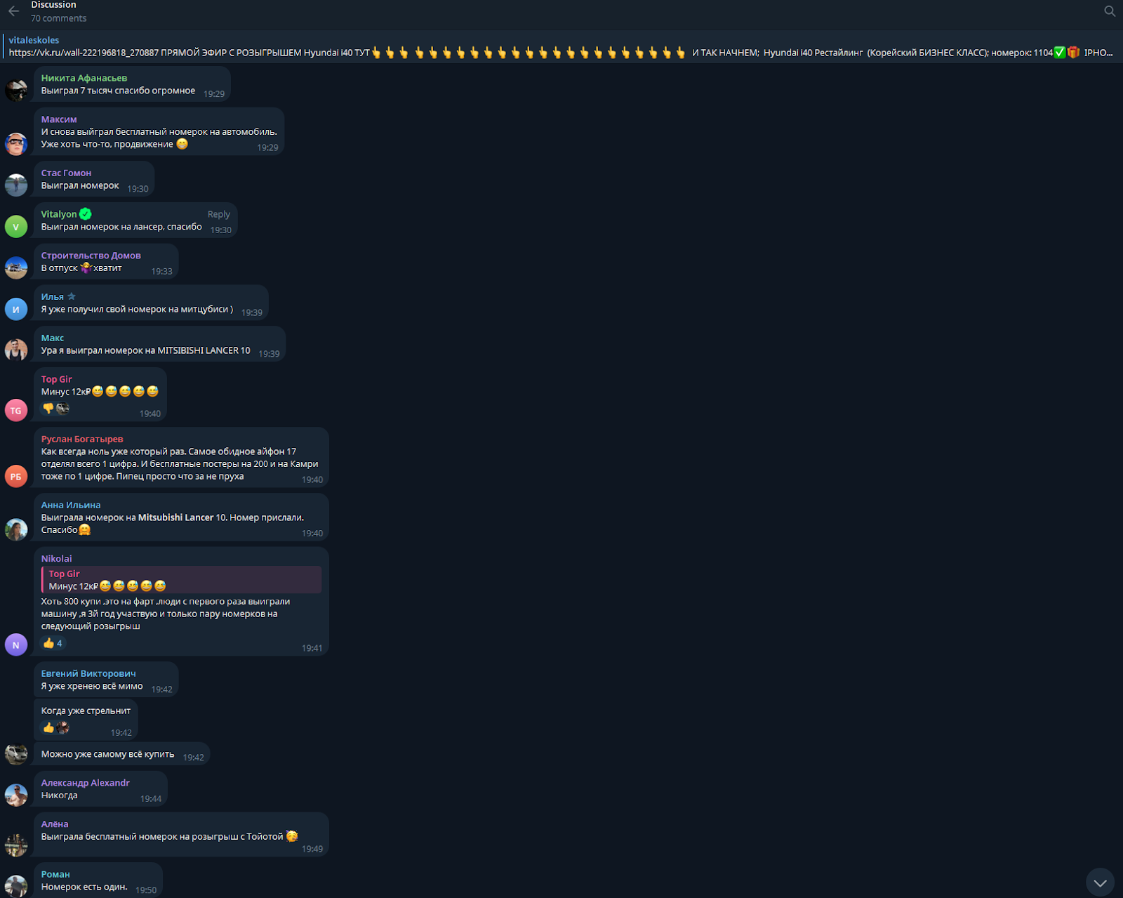 С другой стороны, довольные участники радуются, что проходят дальше по полученному промежуточному билету, чем подогревают интерес остальных подписчиков. При этом реальные истории о получении денег или машин постятся редко, однако каждое такое сообщение активно закрепляется и подается как подтверждение эффективности формата.