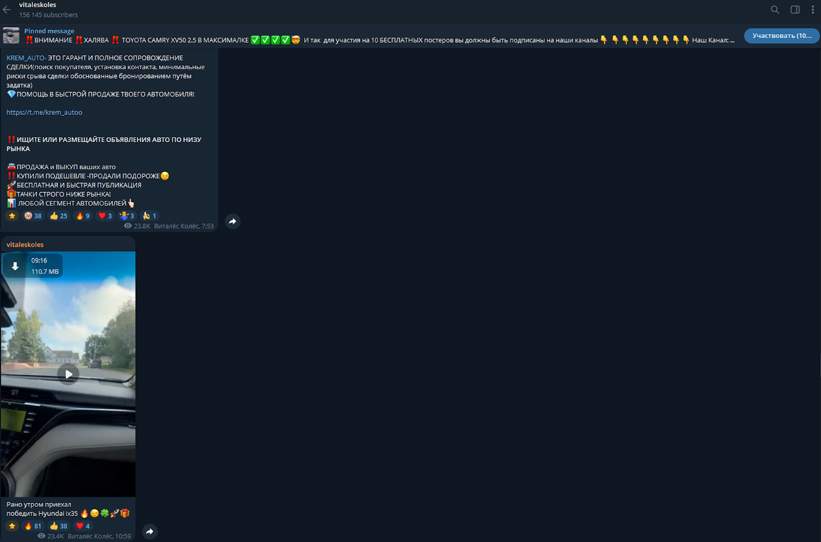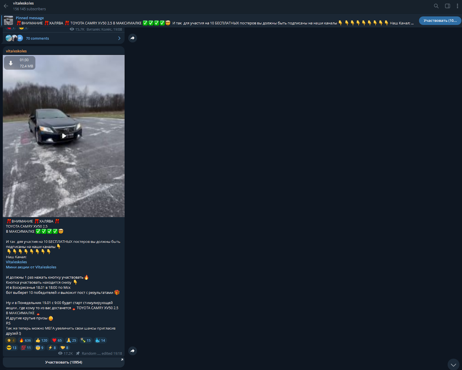 VitalesKoles — телеграмм-канал, который привлекает подписчиков обещаниями раздачи машин и техники. В этом обзоре мы разбираемся, как именно построена работа площадки. Узнаем, стоит ли участвовать, какие нюансы встречаются и что пишут участники паблика.