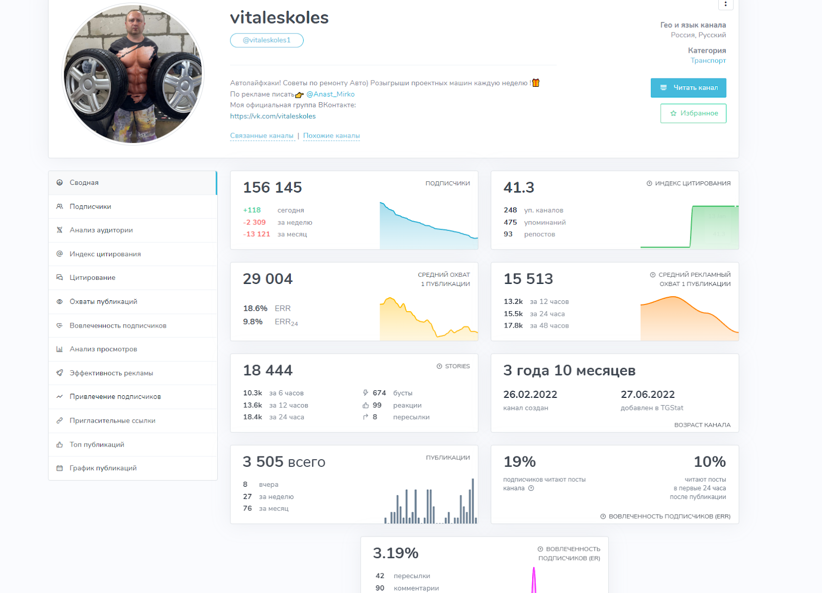 По информации из TgStat, паблик был создан в начале 2022 года. На январь 2025 паблик набрал более 156 000 подписчиков, но читают публикации лишь около 20% аудитории. Канал позиционируется как источник автолайфхаков, но почти весь контент посвящен акциям. На Vitales Koles посты с бесплатными предложениями чередуются со стимулирующими розыгрышами, где участие уже платное. Система движется по кругу: анонс, сбор подписок, выдача промежуточных номеров, итоги и быстрый запуск новой акции.