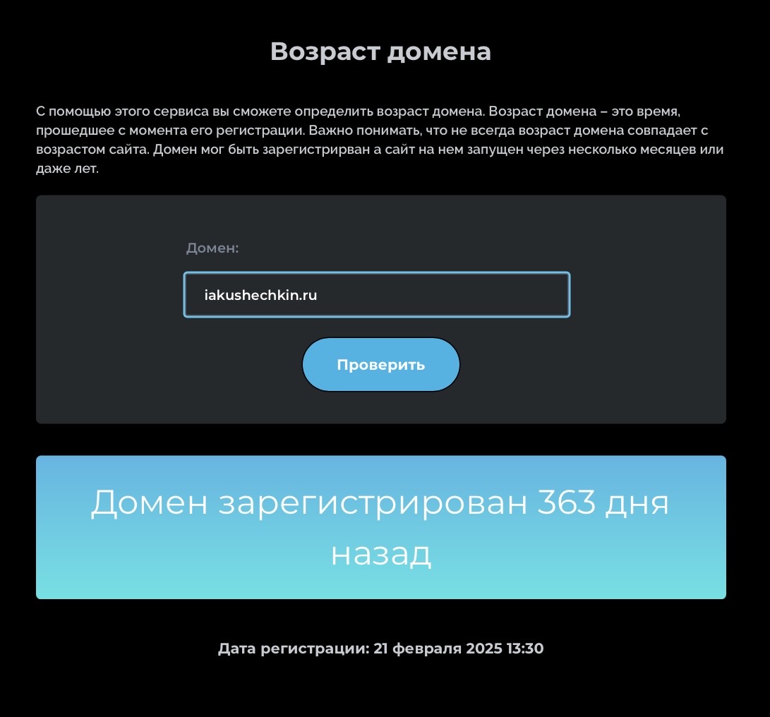 Срок жизни менее года часто свидетельствует о недавнем запуске или масштабном ребрендинге. В инфобизнесе это может быть как признаком молодого амбициозного стартапа, так и методом защиты от накопившегося негатива на старых площадках. Для образовательного проекта, заявляющего о 15-ти летнем опыте автора, такой короткий срок работы текущего сайта требует от пользователя повышенной бдительности.