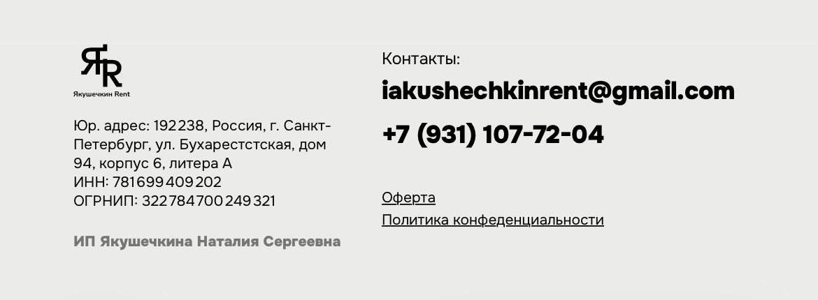 Указан ИП Якушечкина Наталия Сергеевна, а также ИНН и ОГРНИП, плюс адрес в Санкт-Петербурге и телефон/почта для связи.