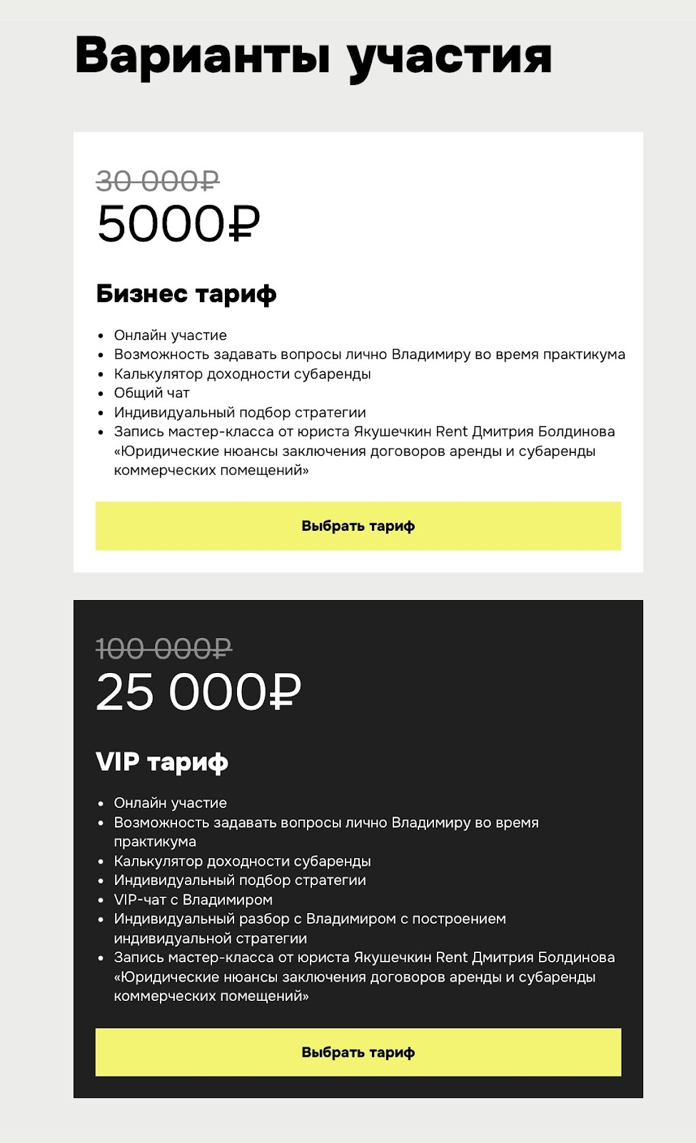 На момент проверки лендинг показывает два варианта участия со скидками: бизнес и VIP тариф.