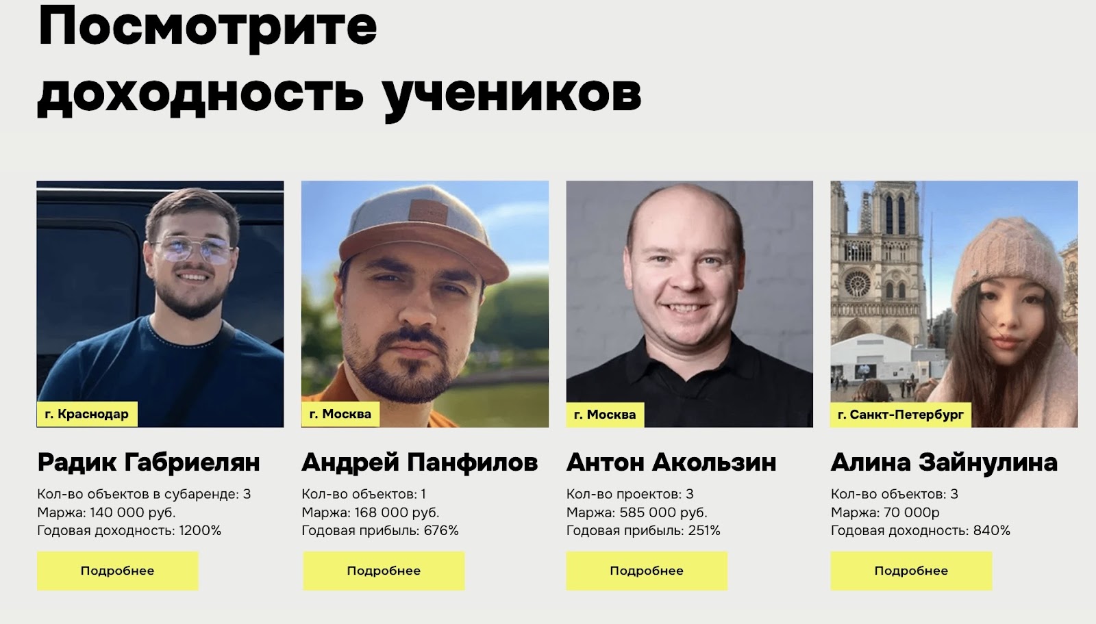 На лендинге опубликованы кейсы с показателями маржа и годовая доходность, плюс детали по отдельным объектам: адрес, площадь, срок договора, платеж собственнику, оборот, вложения, срок поиска и срок заселения.
