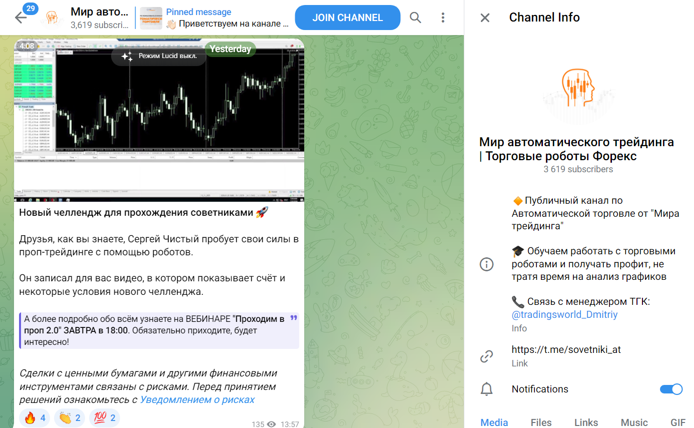 Тг-канал Мир Автоматического Трейдинга ведется с 2022 года, и здесь 3.6k пользователей.