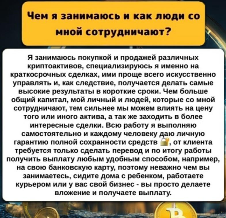 Условия сотрудничества автор описывает в личных переписках и переписках. В ленте он лишь рассказывает о десятикратном увеличении инвестиций. От пользователя требуется внести депозит на торговую сессию. Владислав в течение суток обещает вернуть деньги с прибылью. Переживать инвесторам якобы не стоит, так как он работает с гарантом и деньги вернет в любом случае.