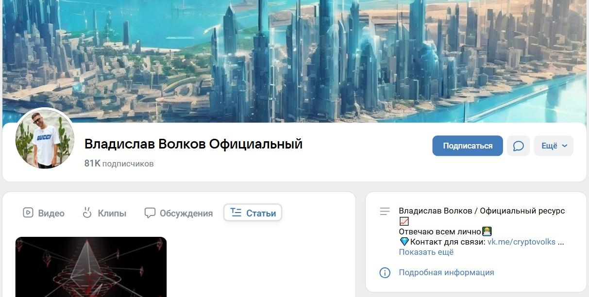 Проект по заработку на крипте Владислава Волкова работает через ВКонтакте. Автор набирает людей, которые готовы инвестировать в его торговую сессию. Он обещает увеличить инвестиции кратно всего за сутки. На канал автора подписано около 81 тысяч человек.