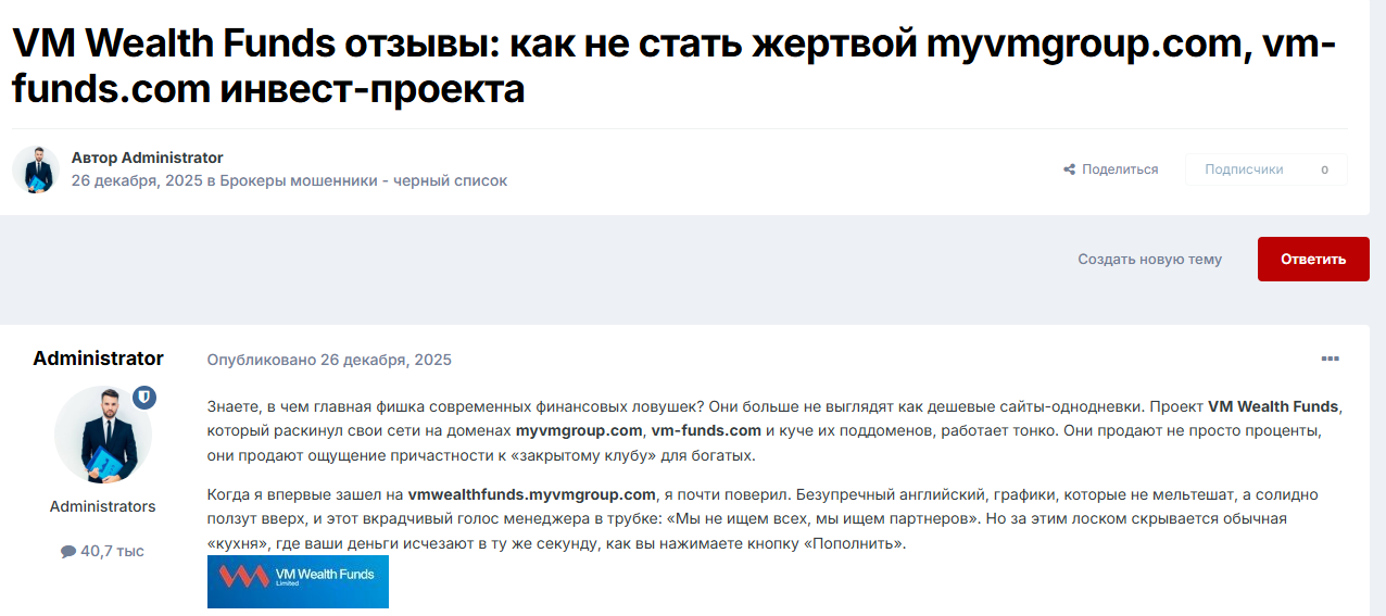 Полноценных отзывов от реальных клиентов на Vm Wealth Funds вообще не нашлось, хотя, по заявлениям создателей, их компании уже более 25 лет. Как такое возможно – непонятно. Дополнительно еще и смущают разоблачения на форумах от администраторов. Серьезных аргументов в этих материалах мы не нашли, но репутация брокера явно на низком уровне.