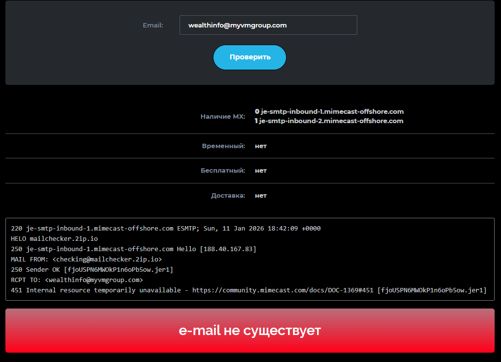 Также мы решили проверить e-mail: сторонний сервис показал, что такого почтового ящика даже не существует. С телефоном, вероятно, та же проблема, и все контакты – фейк.