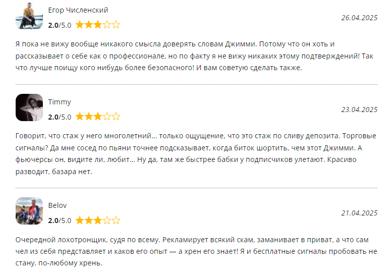 Сигналы Джимми — это просто пустая трата времени и денег. Он показывает только плюсовые сделки, а про минусы молчит. Партнёрка биржи — вот его реальная цель. Не ведитесь на эти разводы.