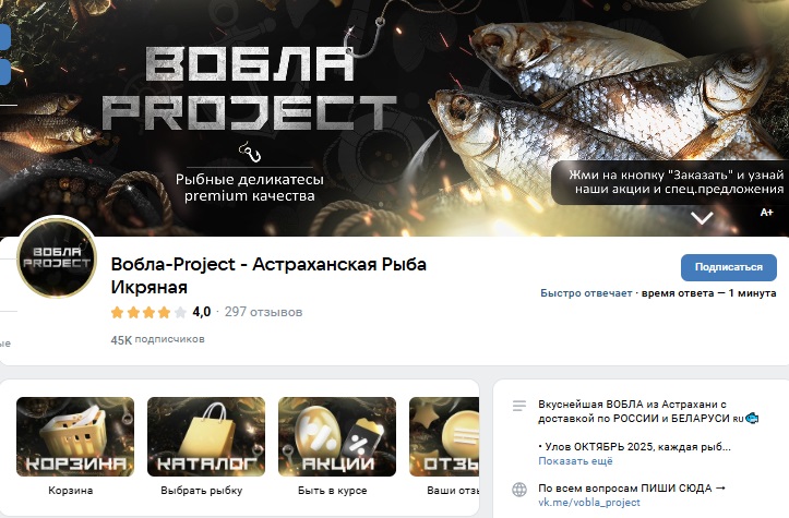 Кроме Телеграм, в качестве интернет-магазина активно используется ВК Вобла-Project — Астраханская Рыба Икряная. Это довольно большое сообщество, в нем 45К участников. Это полноценный маркет с возможностью выбрать товар и сразу оформить покупку.