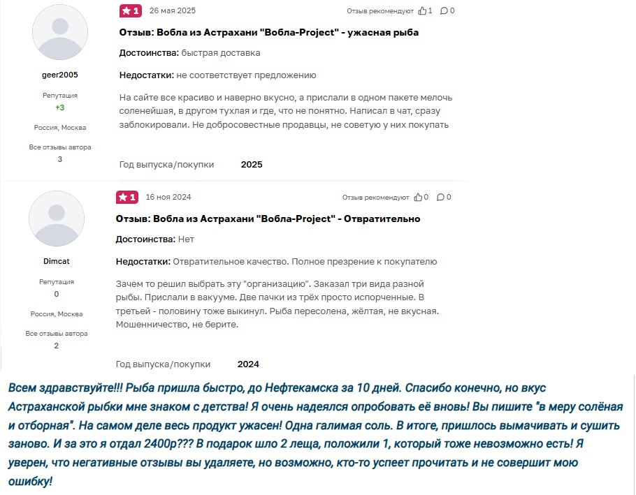 На независимых площадках о рыбном маркете Vobla Project Ivan отзывы совсем другого характера. Большинство жалоб поступает на то, что рыба пересоленная или пересушенная, часто приходит желтая, тухлая, с запахом тины, совсем непригодная к употреблению.