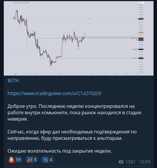 Контент сообщества почти полностью состоит из аналитики криптовалютного рынка, хотя в первых постах трейдер больше интересовался фьючерсами и акциями с Московской биржи. Лента заполнена постами со скриншотами с ресурса TradingView и взглядом автора проекта на ситуацию. Конкретные торговые сигналы не публикуют.
