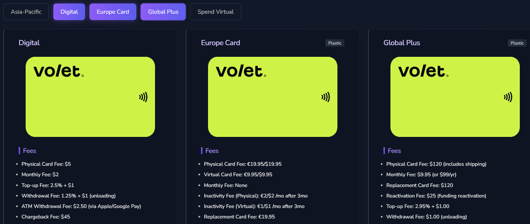Есть отдельные тарифы, предназначенные для определенных регионов, но везде процесс перевода денег с крипто-кошелька Volet на карту занимает считанные секунды.