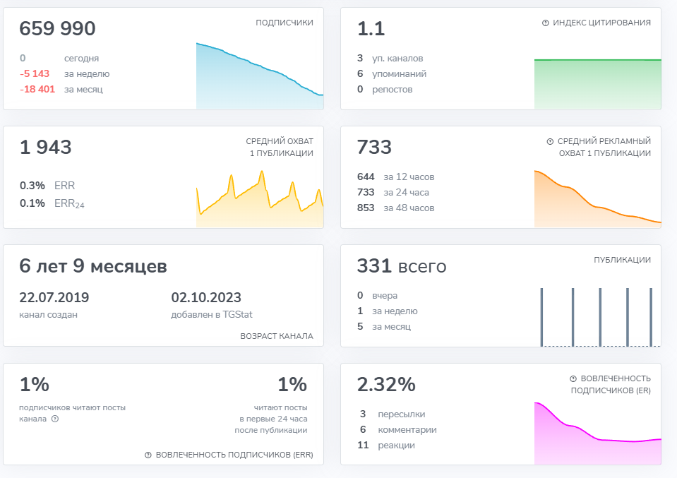 Отдельных сообществ у продукта нет, но у компании много подписчиков в социальных сетях, например, на канале в Телеграмм аудитория составляет 650 000 пользователей, хотя только 1% из них просматривает посты. Вряд ли такой крупный сервис работает с накруткой, но все же показатели говорят именно об этом, ведь даже вовлеченность не доходит до 3%.