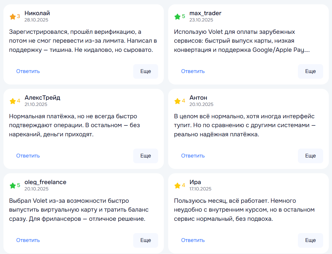 Сервис Volet вызывает серьезные сомнения. Отсутствие прозрачности в отношении владельцев и местоположения офиса, а также скрытые комиссии за пополнение счета и карт делают его использование дорогим и неудобным. Кроме того, отсутствие четкой информации о курсах обмена и ограниченные возможности для российских пользователей ставят под вопрос надежность и целесообразность работы с этой платформой.
