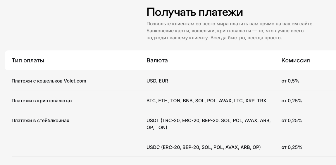 В целом платформа Volet подходит для увеличения заработка для бизнеса за счет интеграции криптоплатежей, ведь комиссии сервиса не такие уж и высокие, в некоторых случаях даже ниже комиссий банковского эквайринга.