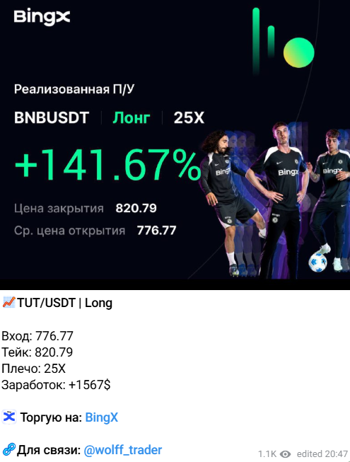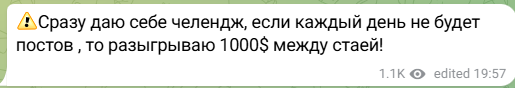 Уже в первом посте в истории канала присутствовала реклама криптовалютной биржи BingX, а также ссылка на покупку платной подписки. Это свидетельствует о том, что перед нами никакой не авторский блог опытного трейдера, а очередной коммерческий проект. Наставник заверяет, что в ленте каждый день будет выходить актуальный контент. В противном случае, он разыграет 1 тысячу долларов между членами «стаи».