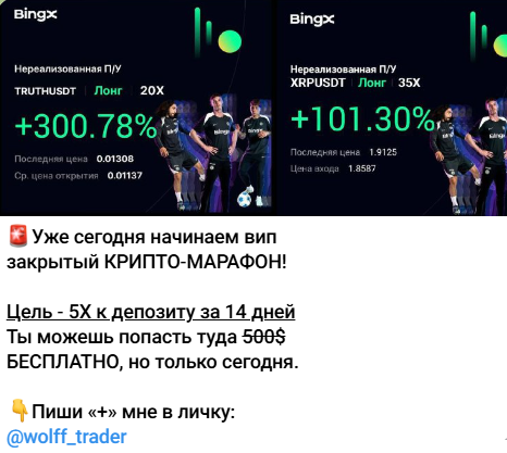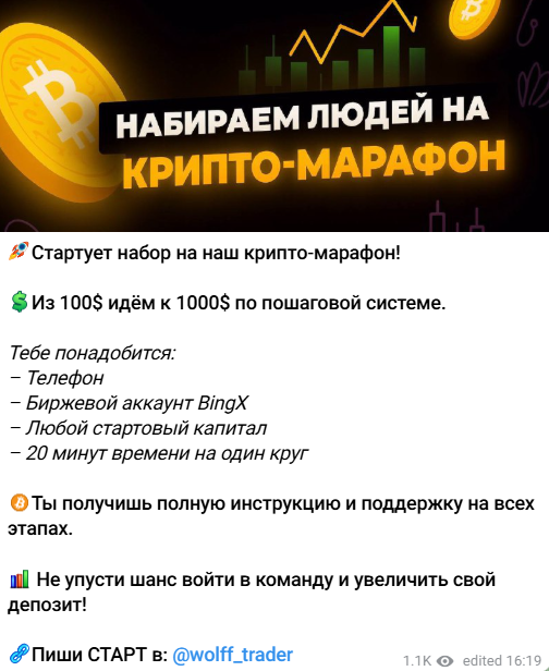 Куда интереснее для трейдера прорекламировать марафон заработка. Сразу после подписки на телеграмм-канал «Волки с Крипто Стрит» пользователь получает сообщение от бота. В нем потенциальному клиенту предлагают поучаствовать в этом мероприятии, приумножив стартовый депозит в 5 раз всего за 14 дней.