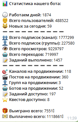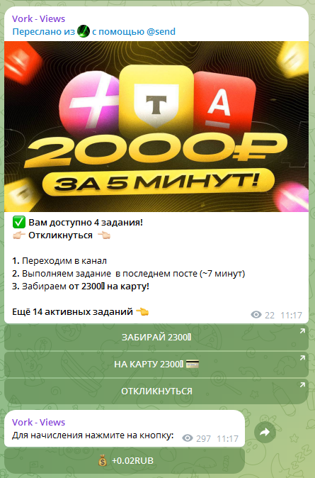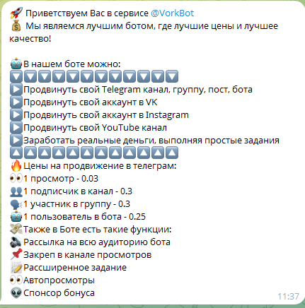 С помощью функционала бота можно продвинуть телеграм-канал, пост, аккаунт ВК, канал на «Ютьюбе», а также заработать деньги, выполняя задачи, не требующие обладания специальными навыками.