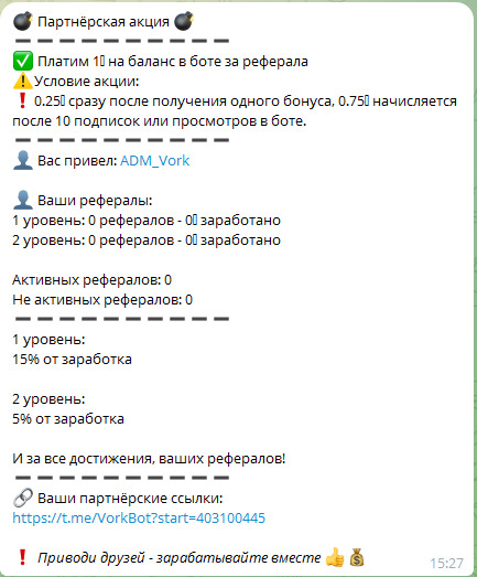 Организаторы сервиса выкладывают в группу для заработка скриншоты перечислений средств клиентам. Они утверждают, что техподдержка «Ворк» бота в ТГ работает круглосуточно, выплаты производятся в течение 1 минуты. Кроме этого создатели портала обеспечивают участников пассивным доходом. Для этого нужно активно приглашать на проект своих друзей, тогда можно будет дополнительно получать от 5 до 15% от заработка.