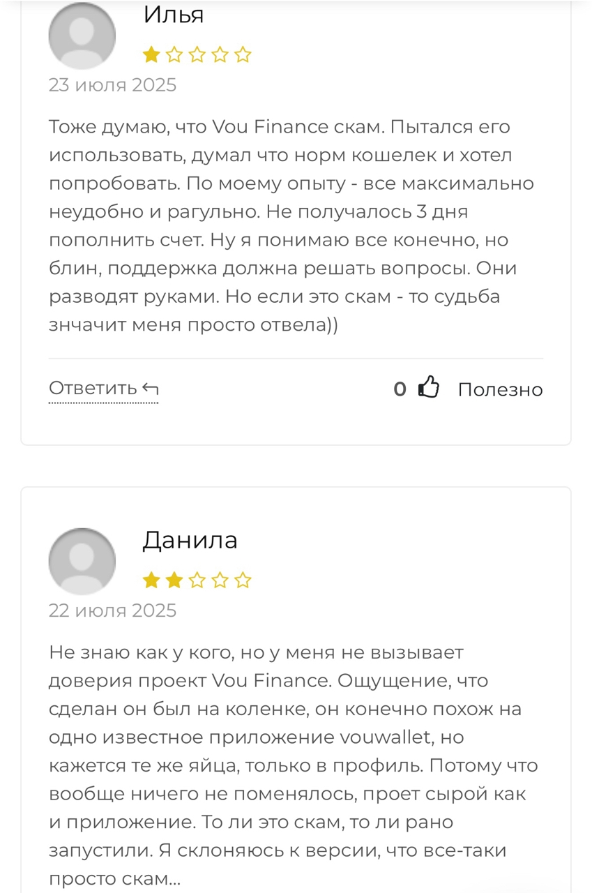 На Vou finance отзывы весьма скептические. Пользователи отмечают ненадежность сервиса и сомневаются, что он работает легально. Многие считают, что использование кошелька приведет к потере денег.