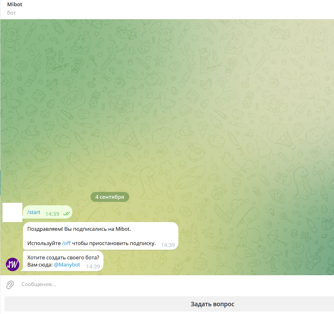 На канале найдена реклама непонятного ТГ бота My_invest1bot, функционал которого неизвестен. После активации предлагают задать вопрос или создать свой собственный бот в ТГ.
