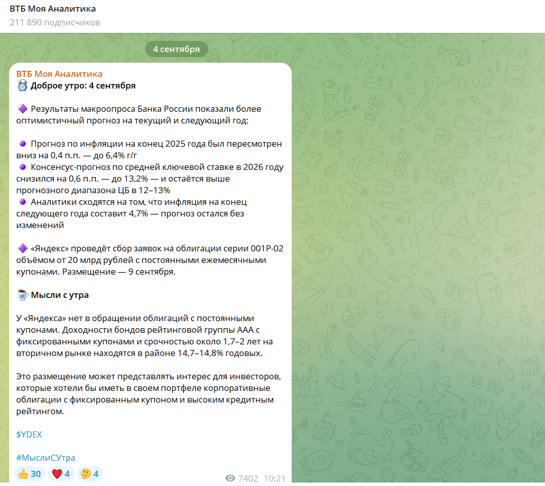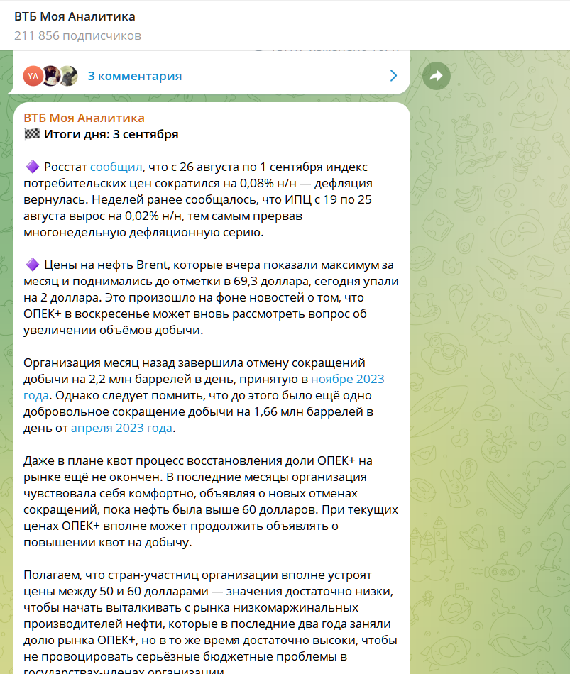 Обзор прогнозов, новостной ленты канала «ВТБ моя аналитика» Телеграмм