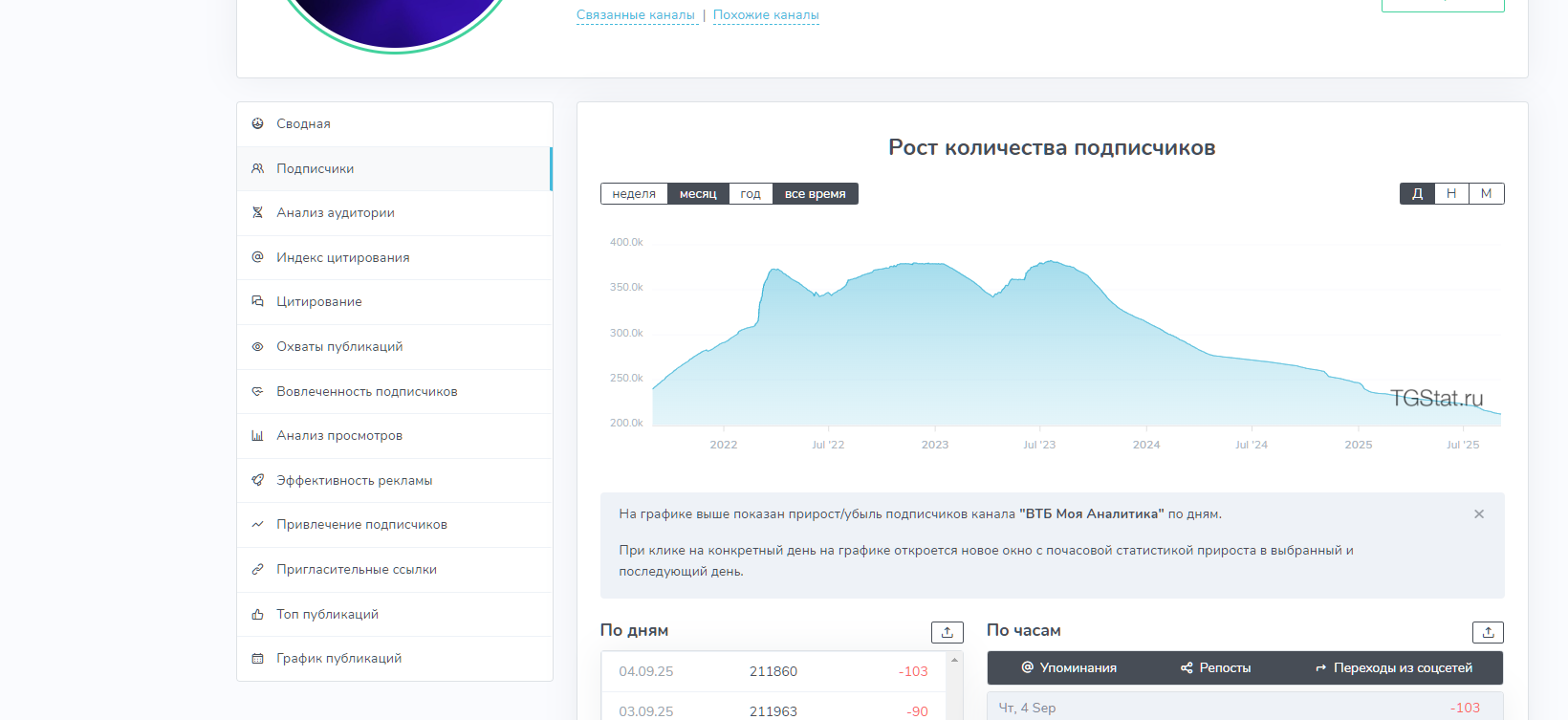 Максимальное количество подписок на канал наблюдалось в июле 2023 года, потом люди начали покидать проект. С чем это связано, выяснить не удалось. Но по статистике подписок видно, что канал перестал пользоваться популярностью.