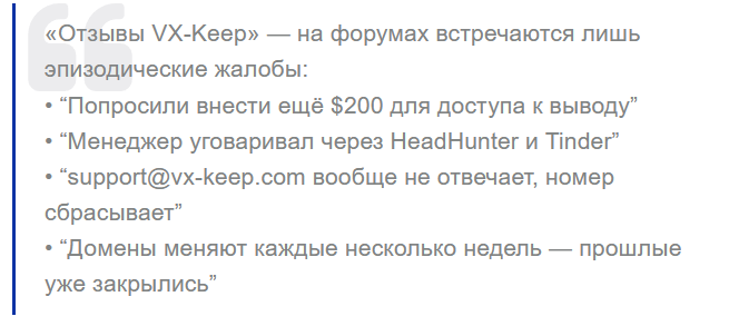 Требуют доплатить «налог» 15%, «страховку» 3%, «API-комиссию» $120, «верификацию» $200. Список растет как снежный ком. Пополнение идет на криптокошельки и карты физлиц. Никаких корпоративных счетов. Клиенты рискуют остаться ни с чем. После отказа платить аккаунт попадает под блокировку. А техподдержка support vx keep com перестает отвечать.