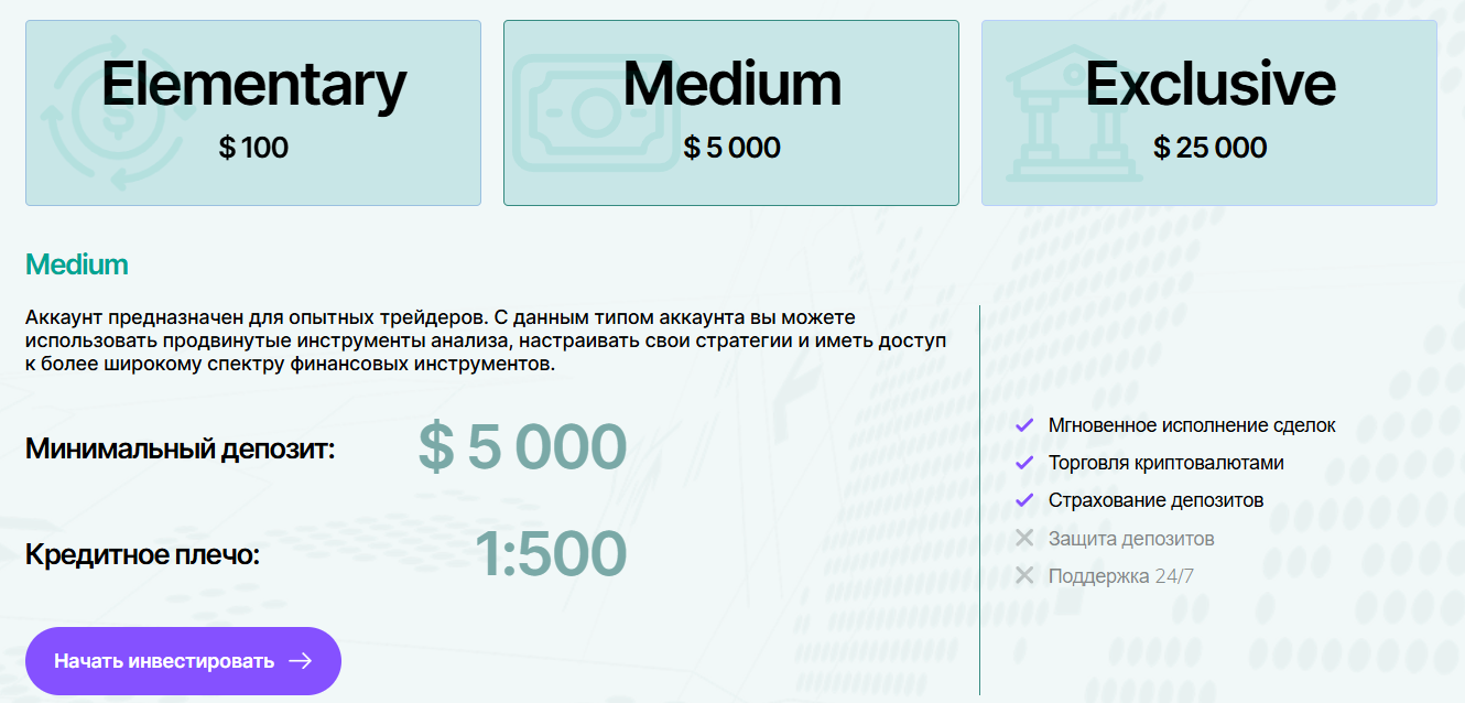 - medium за $5000. Плечо 1:500. Доступна крипа и страхование депозитов;