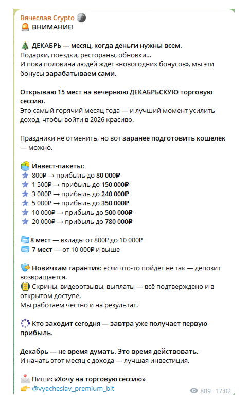 Вячеслав говорит, что зарабатывает на «свежих» токенах: якобы находит новые монеты, заходит раньше других и ловит рост. Делает акцент на «глубоком анализе» и «выборочности», будто без его участия не справиться. К середине декабря 2025 года в канале уже около 30 тысяч подписчиков, при низкой активности под постами это выглядит как накрутка.