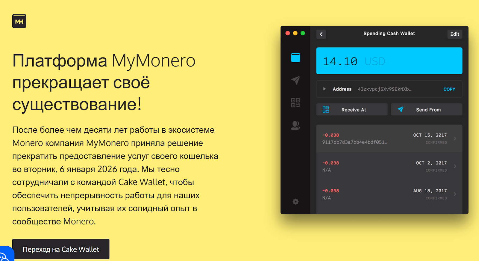 С 6 января 2026-го платформа Май Монеро уже не работает. Пользователям предлагают инструкцию по переходу на новый кошелек под названием Cake Wallet. Сам процесс переноса денег проходит в несколько шагов: