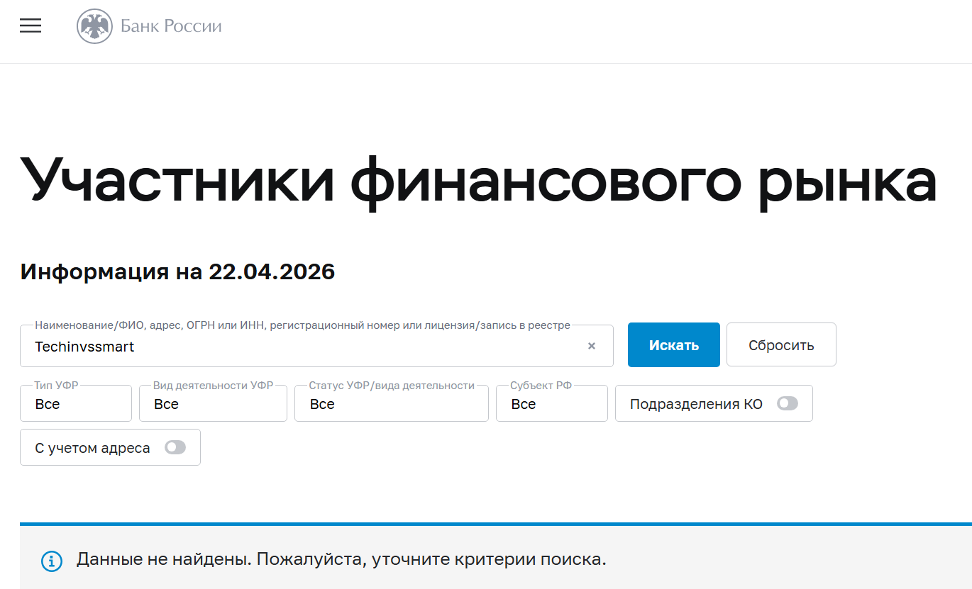 По данным из открытых источников, брокер Techinvssmart Com найден в списке участников финансового рынка, которых обоснованно подозревают в мошенничестве по состоянию на апрель 2026 года.