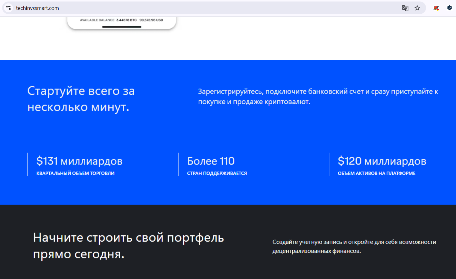 Techinvssmart Com — это брокер, работающий через несколько адресов: личный кабинет, Way Techinvssmart Com, и отдельный домен с торговым терминалом. На главной странице привычный для подобных структур визуал: доступ к рынкам, личный кабинет с аналитикой, инфраструктура под частного инвестора. Дальше маркетинг: низкий порог входа, графики в реальном времени, круглосуточная поддержка. При этом ни тарифной документации, ни условий обслуживания в открытом доступе не обнаружено. Как работает сервис и стоит ли доверять ему управление своими средствами, читайте в статье.