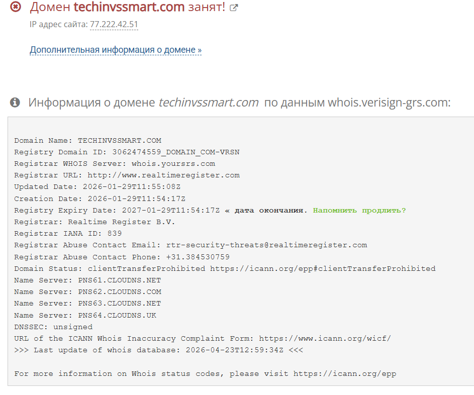 Основной домен Techinvssmart Com зарегистрирован 29 января 2026 года, данные о владельце скрыты.