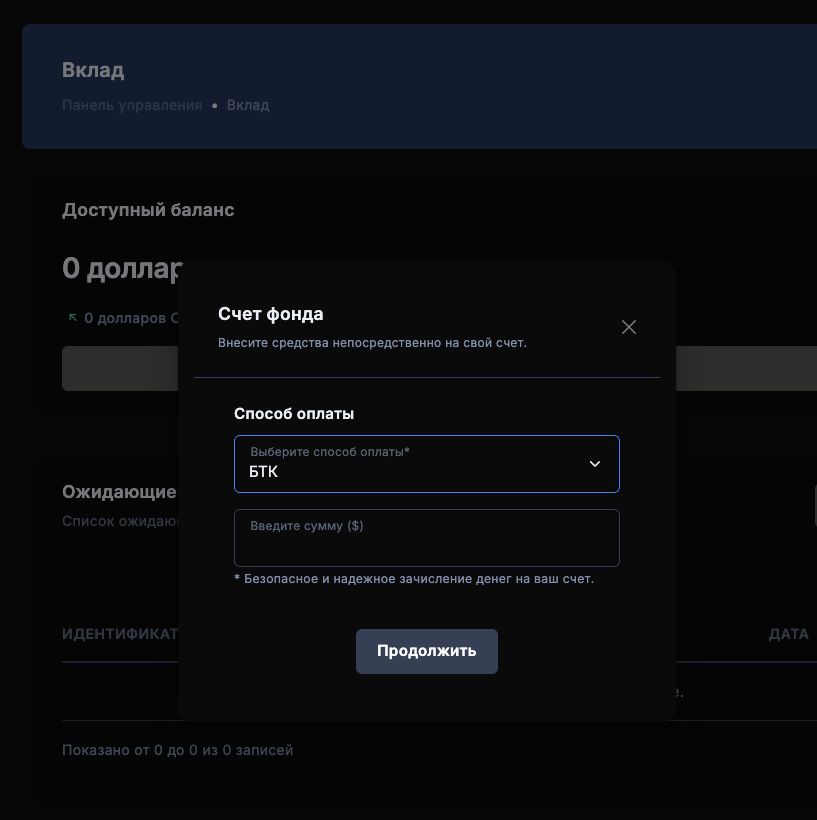 Внести деньги на баланс этой площадки можно только с bitcoin-кошелька. Очень странно выглядит то, что в русскоязычной версии личного кабинета название криптовалюты BTC переведено как БТК.