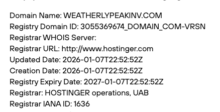 Мы запросили данные домена Weatherlypeakinv Com из WHOIS. В итоге выяснили, что этот адрес регистратор выдал только 7 января 2026 года. Другие домены к ресурсу не привязаны.