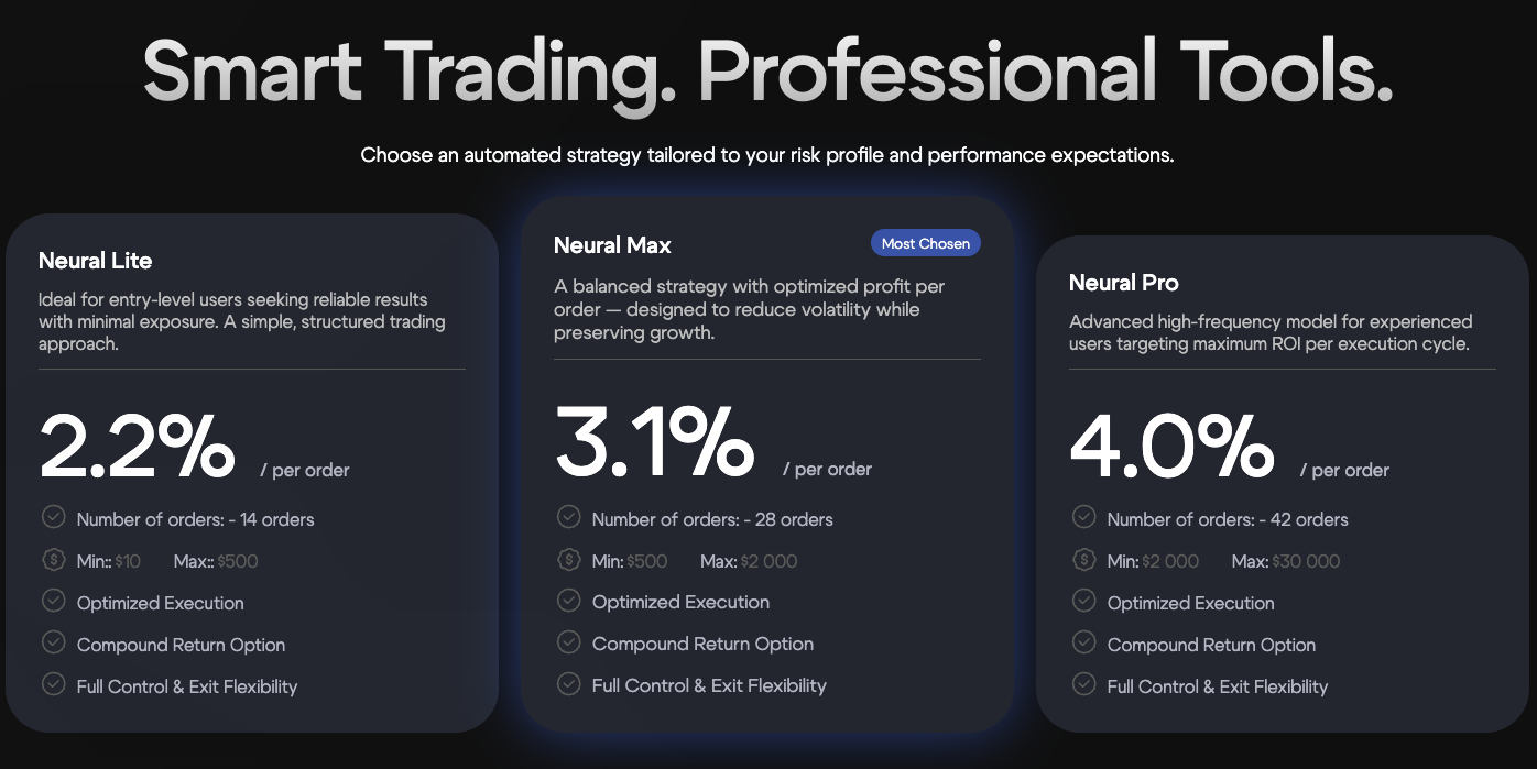 Обещания прибыли от 2,2% до 4% за сделку при минимальном вкладе в $10 выглядят нереалистично. Отсутствие информации о компании и недавняя регистрация домена (январь 2026) вызывают серьезные сомнения в надежности проекта.