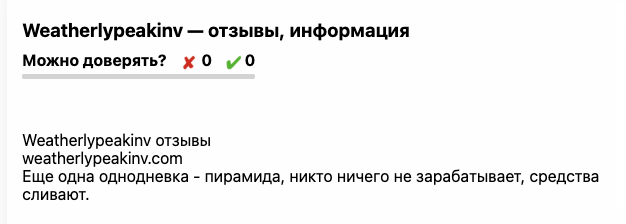 Фидбэка о рассматриваемом проекте в интернете почти нет. Наша редакция обнаружила только один отзыв о Weatherlypeakinv Com.