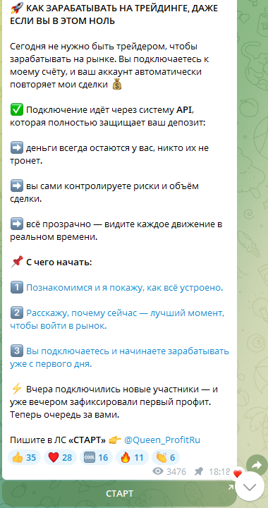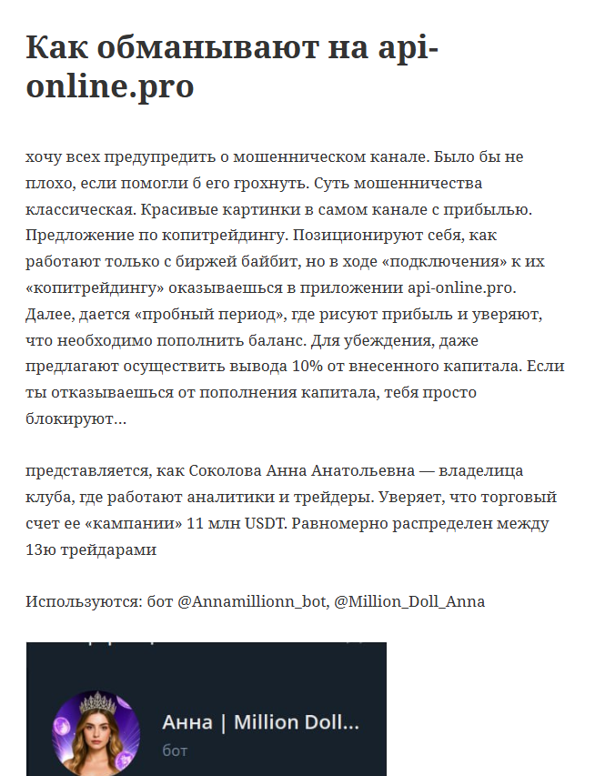 Сайт Веб Апи Про – лишь одна из копирок. Вероятно, за их созданием стоит команда мошенников, запускающая Телеграм-каналы о копитрейдинге. Пользователям демонстрируют легенду о некоем успешном трейдере, зарабатывающем миллионы на торговле. Он начинает предлагать копирование сделок через API, якобы через биржу Байбит. На деле пользователей просто привлекают на фейковый сайт, пользователям рассказывают о том, что он является «безопасным шлюзом».