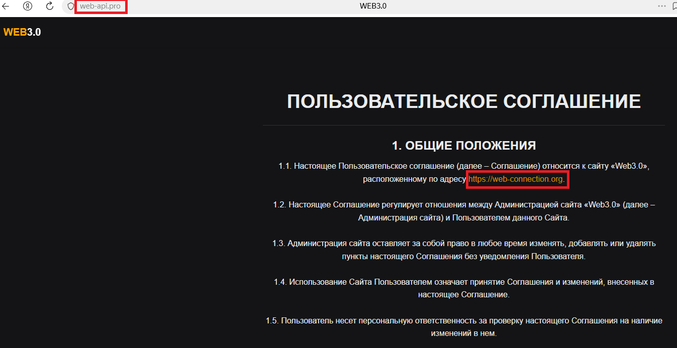 Интересный момент заключается и в том, что в соглашении для площадки Веб Апи Про используется ссылка на совершенно иной сайт – web connection org.