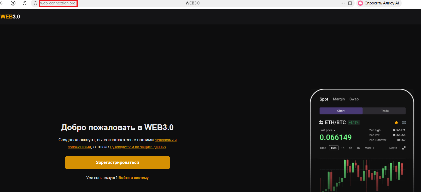 Создатели пытаются связать свою платформу с криптобиржей Байбит: на самой странице используется схожее дизайнерское оформление, а в фавиконе так и вовсе указан логотип известной площадки. На деле никакого отношения к Байбит сервис не имеет. Это – еще один резко негативный фактор.