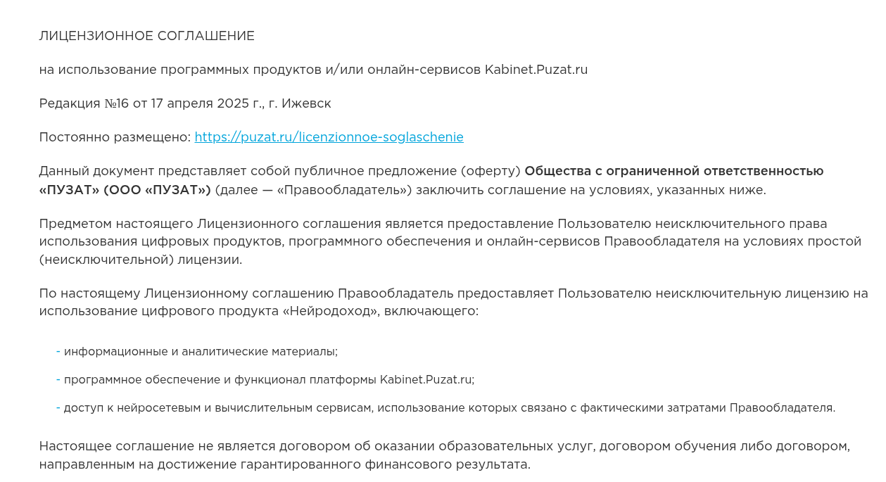 Лицензионное соглашение содержит важнейший нюанс. Документ прямо подчеркивает, что компания не оказывает образовательные услуги и не проводит профессиональное обучение. Клиент покупает лишь неисключительные права на цифровые продукты, программное обеспечение и онлайн-сервисы вроде Kabinet Puzat Ru. Договор не гарантирует достижение финансового результата.