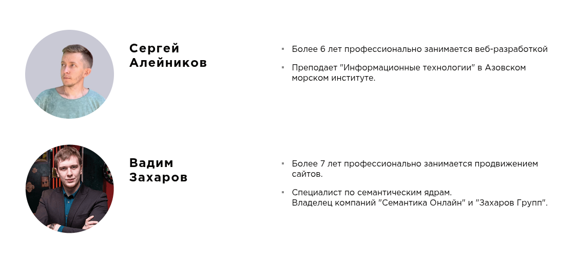Команда Web Dohod Ru — SEO-специалисты и веб-разработчики. Сергей Алейников преподает IT-дисциплины, а Вадим Захаров руководит SEO-проектами. Основная экспертиза наставников — сфера сайтостроения. Глубокий бэкграунд в криптовалютном трейдинге остается за кадром.