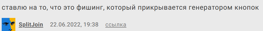 Один из посетителей сайта отмечает, что это наверняка фишинговый ресурс, который прикрывается генератором кнопок. Основная цель таких «поддельных» сервисов как раз и состоит в краже данных клиентов.