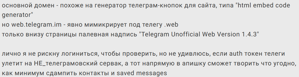 Еще один пользователь отмечает, что сайт «мимикрирует» под Telegram. Внизу страницы есть предупреждение о том, что перед нами «неофициальная версия Телеграм». Комментатор полагает, что заход на данный сайт приведет как минимум к утечке контактов и сообщений из мессенджера.