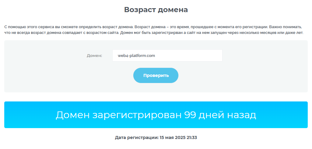 Мы проверили дату регистрации домена web4 platform com – это 15 мая 2025 года. За такой срок компания не может сформировать устойчивую репутацию.