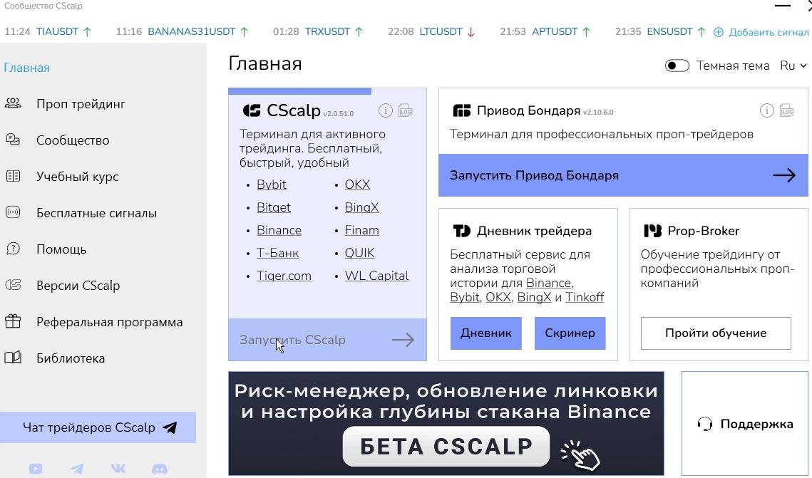 Это бесплатное обучение Web CScalp и сниженные комиссии на Binance, а также коннект к известным брокерам, криптобиржам и даже личный «Дневник Трейдера».