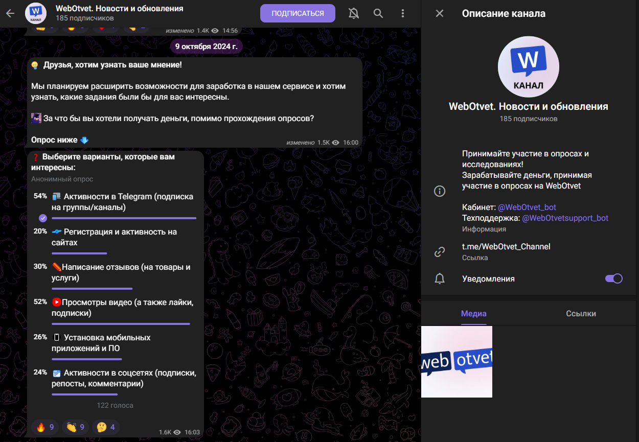 У проекта есть публичный канал в Телеграмм, зарегистрированный 30 августа 2024 года. Первый пост сообщает о минимальных лимитах вывода заработанных денег – от ₽100. Чуть позже «ВебОтвет» заявляет о намерении расширить возможности для заработка и предлагает проголосовать за интересные варианты:
