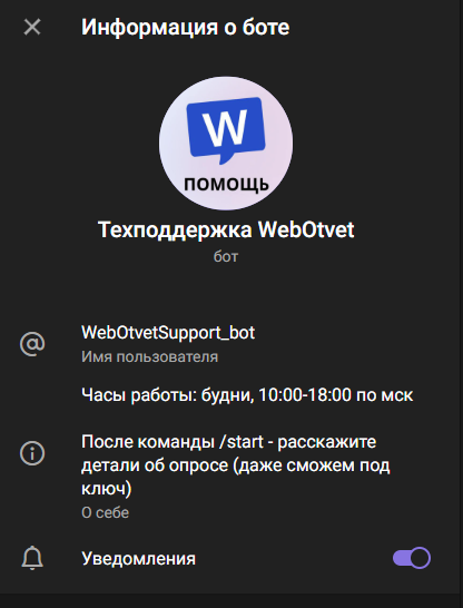 Регистрация в системе осуществляется через телеграмм-бота, но на февраль 2026 года соединение не устанавливается. С данным вопросом можно обратиться к саппорту WebOtvet. Техподдержка работает по графику – только в будни, с 10:00 до 18:00 по Мск.